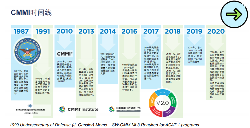 CMMI全称是软件能力成熟度模型集成,是由美国国防部与卡内基梅隆大学下的软件工程研究中心(SEI)以及美国国防工业协会共同开发的一套软件体系规范,主要用于指导软件开发过程的改进和软件开发能力的评估。 从1991年开始CMM陆续应用与多个领域,如:软件工程、系统工程、软件采购、集成产品与过程开发等,由于实际应用需要,2000年集成了软件工程、系统工程、集成产品与过程开发而发布了CMMI v1.0,于2002增加了供应方采购管理发布了CMMI v1.1。在CMMI持续改进的理念下,CMMI 在2006年8月发布了CMMI-Dev v1.2 。2010年11月发布CMMI模型1.3版。CMMI 1.3包括CMMI采购模型1.3版、CMMI开发模型1.3版、CMMI服务模型1.3版。2018年3月28日发布CMMI2.0版,目前正在展开CMMI2.0的相关培训和推广工作。