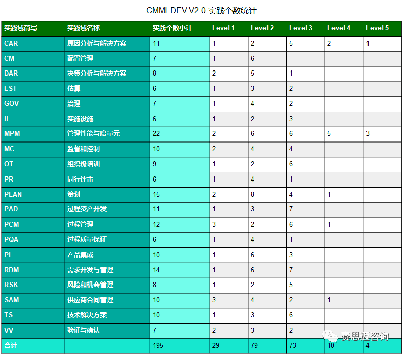 CMMI DEV V1.3中有22个过程域,而目前发布的CMMI DEV V2.0中有20个实践域。其中, 有些实践域保留了原来的名字如CAR,CM,DAR,OT,PI,SAM等;有些实践域对名字做了微调,如MC,PLAN,PAD,RSK,PQA等,有些实践域是新增或者剥离出来的,如EST,PR,GOV,II等;有些实践域则是由原来的多个PA合并而来,如MPM,RDM,VV等。